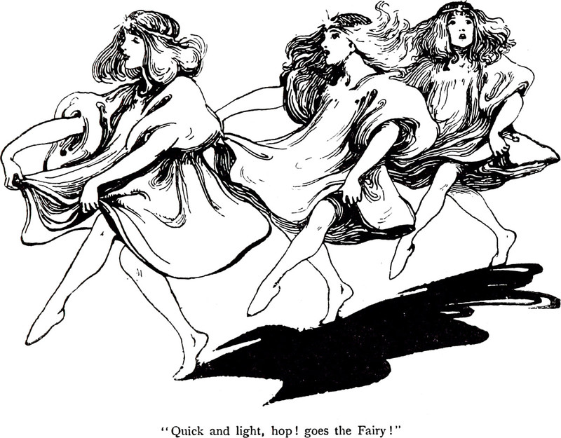 An illustration from The Kitchen Maid by J. Bernard Partridge (1896).  The caption reads: "Quick and light, hop! goes the Fairy!"