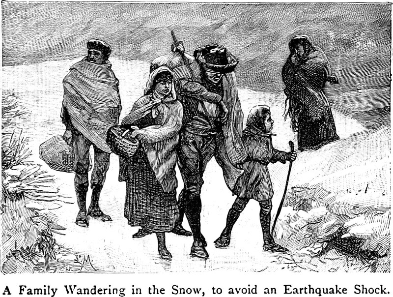 An illustration from Earthquakes by Arnold Boscowitz (1890).  The caption reads: "A family wandering in the snow, to avoid an earthquake shock."