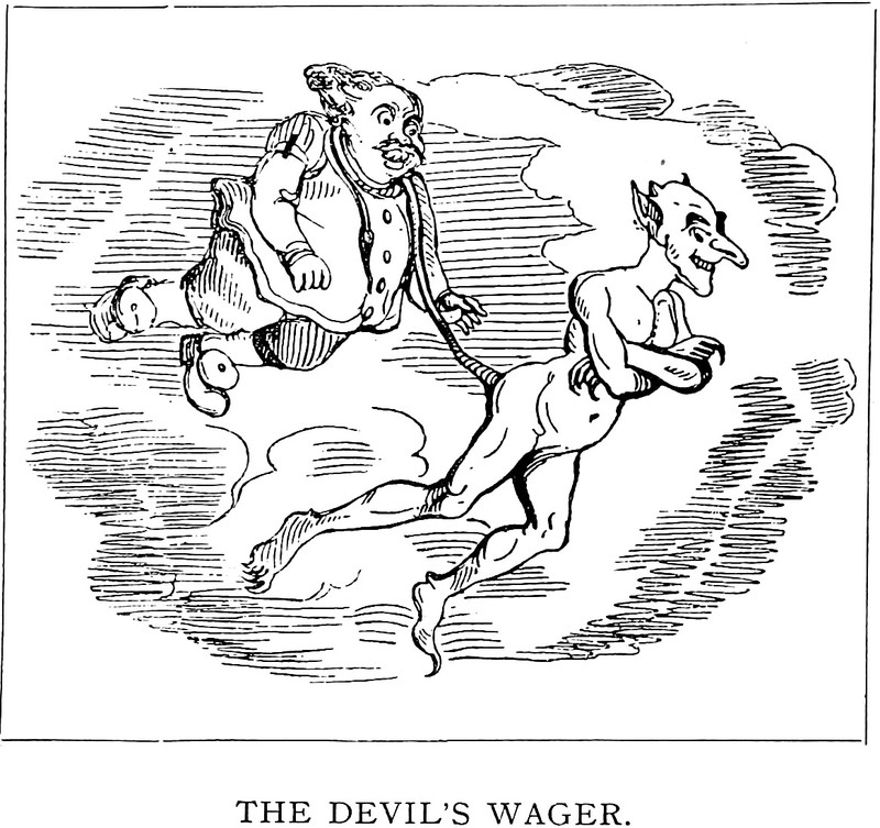 An illustration from Mr. Thackeray's Writings in The National Standard and Constitutional (1899). The caption reads: "The devil's wager."