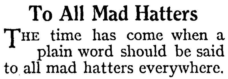 "To all mad hatters.  The time has come when a plain word should be said to all mad hatters everywhere."  From The Children's Newspaper, 1933.