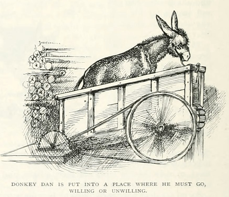 "Donkey Dan is put into a place where he must go, willing or unwilling."  From St. Nicholas, 1889.
