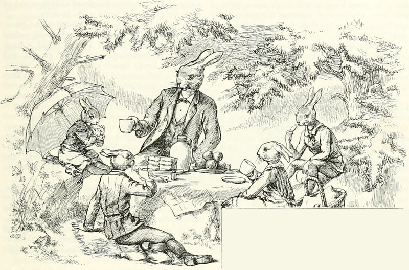 #vintage illustration #anthropomorphism #picnic #rabbit #illustration #1880s