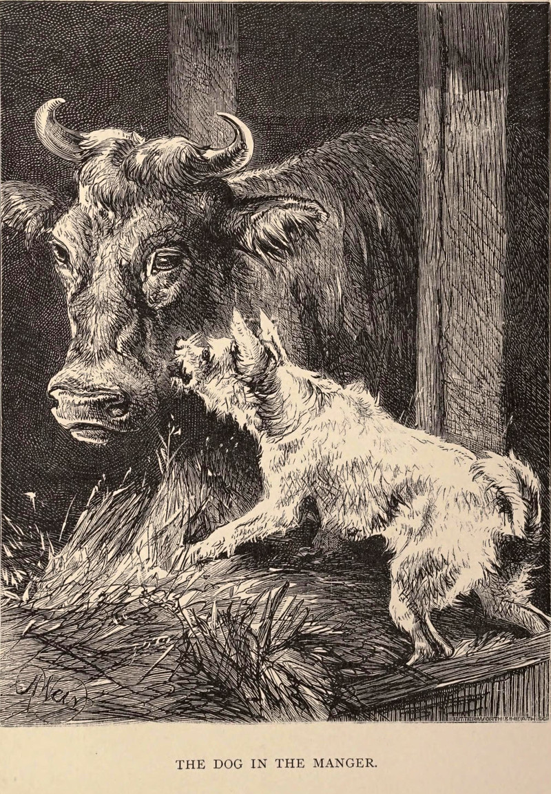 #vintage illustration #fable #cow #dog #1870s #illustration #manger