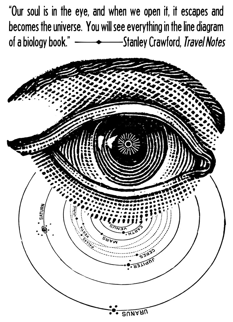 The text reads, "Our soul is in the eye, and when we open it, it escapes and becomes the universe. You will see everything in the line diagram of a biology book." —Stanley Crawford, Travel Notes