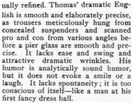 ***It is Expressionism brought to the perusal of temperamental inexpressionism. [Nathan]***in which Voltaire is exhibited as the hero...who devotes his life to changing from one Sulka dressing gown to another, making epigrams... [Nathan]***[The play] has its moments, but they are swallowed up in its hours. [Nathan]***[Singular "shenanigan" dept.]Ervine has covered up the whole obvious shenanigan... [Nathan]***[Pirandello] is the dramatist of a theme's ghost. [Nathan]***[Bonus: A book satirizing censorship, entitled Nonsensorship.]