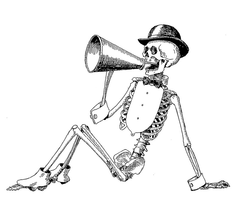 #vintage illustration #skeleton #living dead #vintage yearbook #yearbook #1940s #illustration #bullhorn