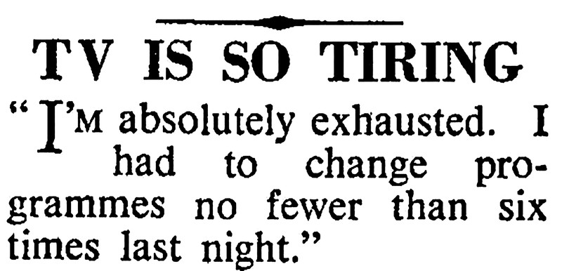 "TV is so tiring.  'I'm absolutely exhausted.  I had to change programmes no fewer than six times last night."  From The Children's Newspaper, 1955.