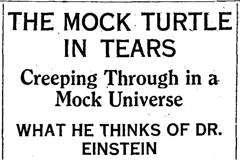 "The Mock Turtle in tears.  Creeping through in a mock universe.  What he thinks of Dr. Einstein."  From The Children's Newspaper, 1919.
