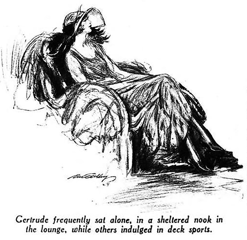 "Gertrude frequently sat alone, in a sheltered nook in the lounge, while others indulged in deck sports."  From Macleans Magazine, 1924.