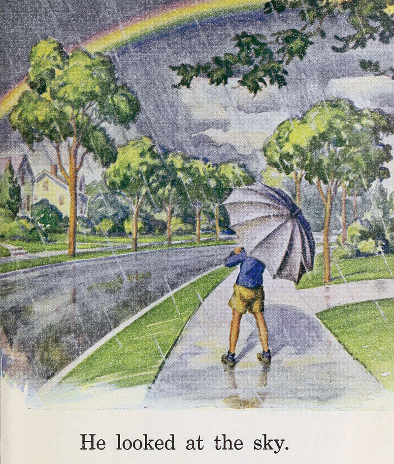 #vintage illustration #rainy day #umbrella #rainbow #1940s #illustration #sky