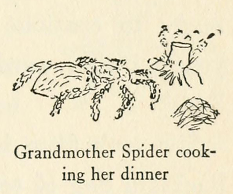 "Grandmother Spider cooking her dinner."  From Taytay's Tales by Elisabeth Willis De Huff and illustrated by Fred Kabotie and Otis Polelonema, 1922.