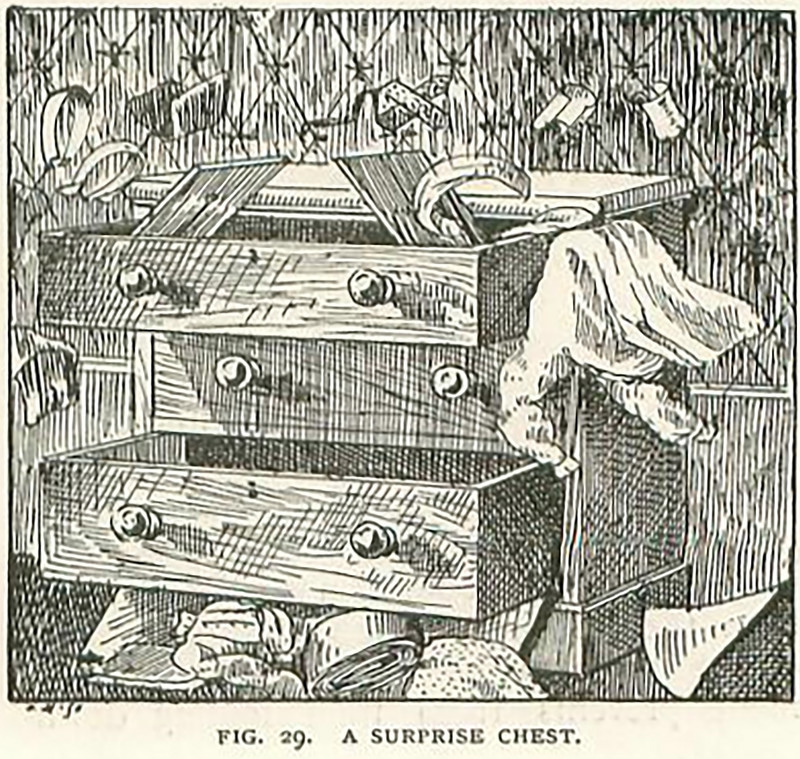 #vintage illustration #practical joke #1890s #illustration #trick furniture #trick cabinet