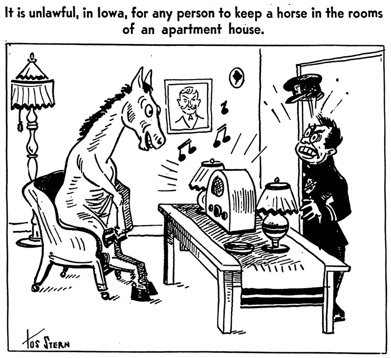 "It is unlawful, in Iowa, for any person to keep a horse in the rooms of an apartment house." From the Massachusetts Society for the Prevention of Cruelty to Animals' Our Dumb Animals magazine, 1945.
