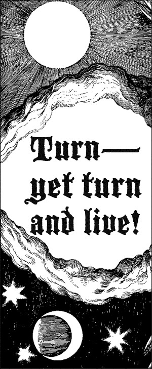 Answer: Angelic. "Turn—yet turn and live!" —Andrew Cleaves, "Chapters on Churchyards," in The Living Age, Vol. VII, Dec. 1845, p. 362. (The answer is in black text on the black background. Highlight it to view.)