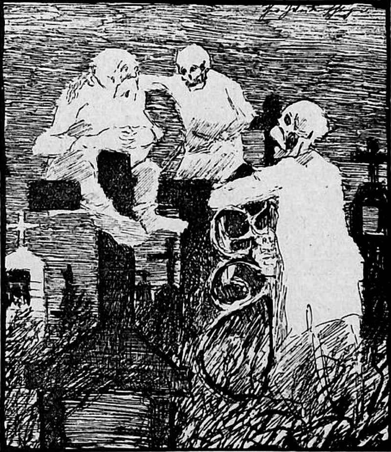 Here's one from our growing (and sometimes glowing) collection of vintage skull imagery. This one is from Le Rire, 1915.