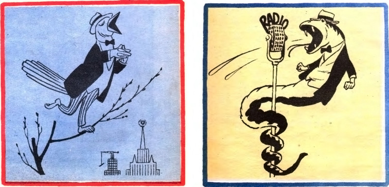 The caption to this panel is a row of dots, like footlights. (In full disclosure, we love giant lighting fixtures.) From Krokodil, 1963.