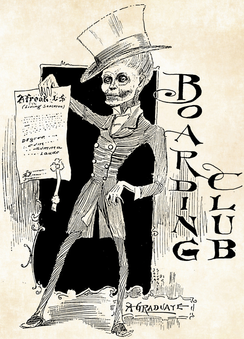 Here's a college graduate depicted as "A Freak L.S. (Living Skeleton)." From the Codex yearbook of Beloit College, 1893. See How to Hoodoo Hack a Yearbook.