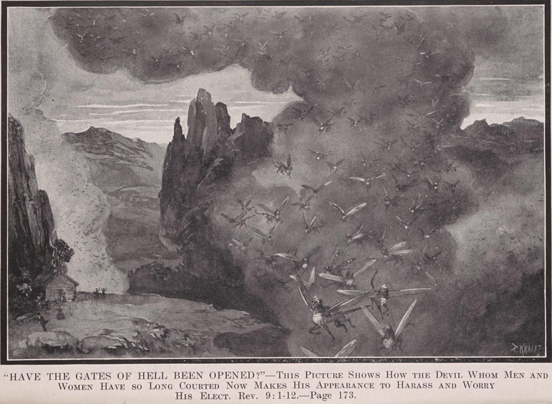 The long-courted devil appears with locust demons to harass and worry his elect. From The Devil's Bride by Milton H. Stine, 1910.