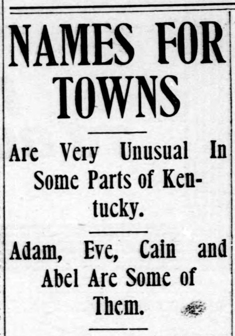 "Names for towns are very unusual in some parts of Kentucky. Adam, Eve, Cain and Abel are some of them." From the Duluth Evening Herald, 1904.