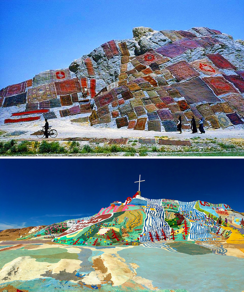 At first glance, we mistook this mountain of carpets near Tehran, Iran for the Sonoran Desert's Salvation Mountain.