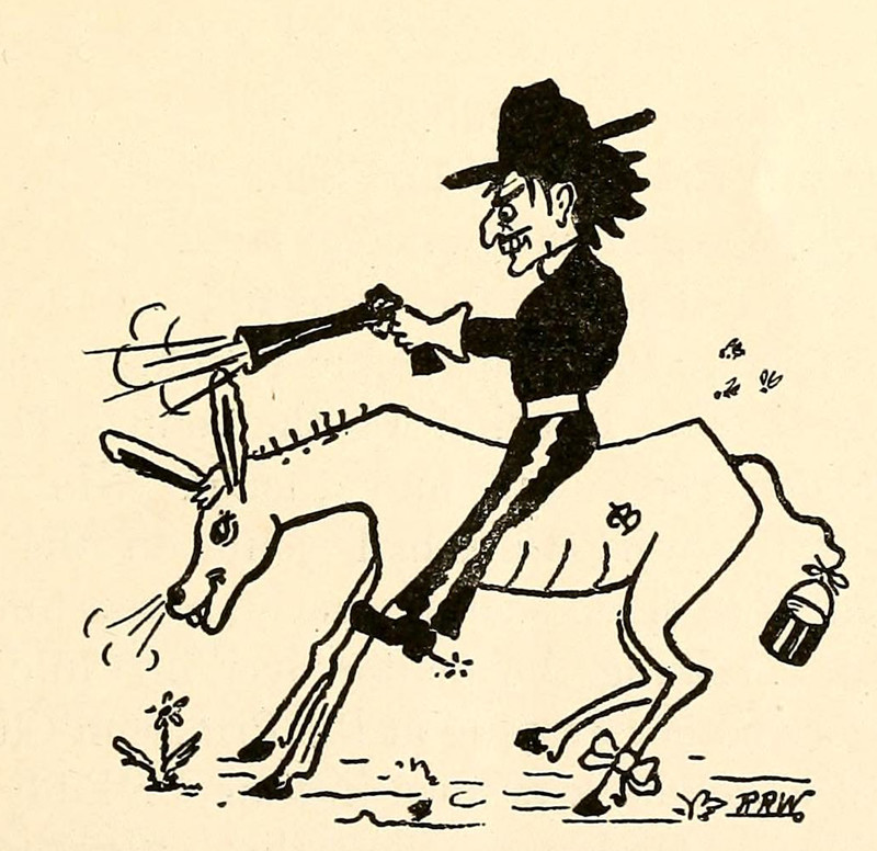 A mule breaks a phonograph with its sweetest notes. From the University of Arkansas's 1905 yearbook.