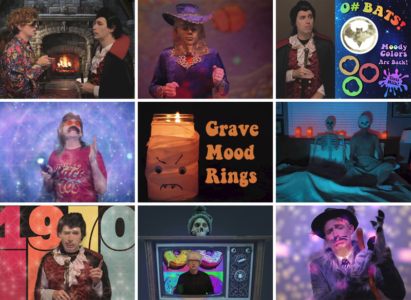 Mixing vampire humor and 1970s tropes (like pet rocks, lava lamps, disco music, bell-bottom pants, mirror balls, and of course mood rings), the web series Grave Mood Rings pokes fast fun at classic slow-moving Gothic soap operas like Dark Shadows and the Canadian series Strange Paradise. In addition to a vampiric Viscount, a castle is home to a groovy Doctor (a phlebotomist, naturally), a jolly housekeeper with her own laugh track, a werewolf Vicar, and an arch-nemesis riddler wearing a Sphinx mask. Corny wordplay, the occasional bizarre sing-a-long, and haunted doughnuts punctuate the proceedings, in the tradition of the sketch comedy of MadTV, Kids in the Hall, and SCTV.