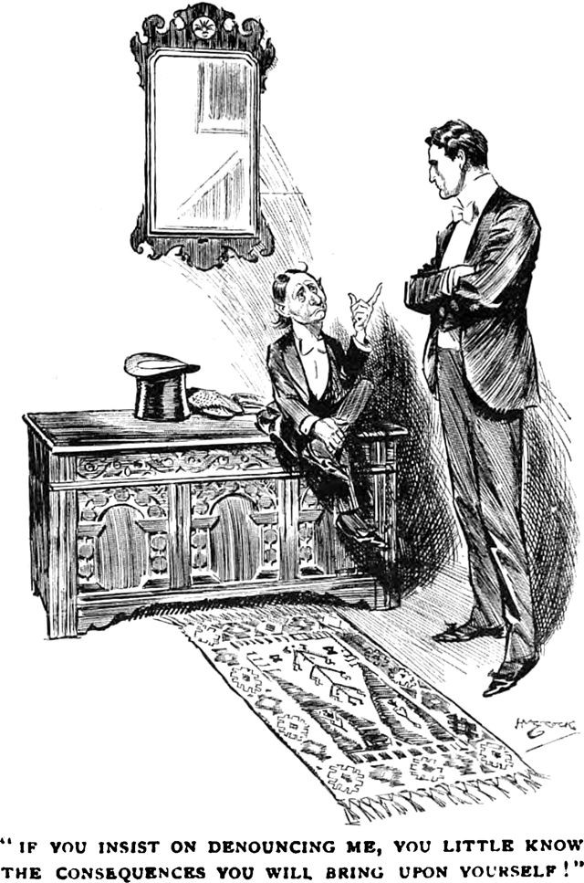 An illustration from a 1907 issue of The Strand magazine. The caption reads: "If you insist on denouncing me, you little know the consequences you will bring upon yourself!" Dedicated to Gordon Meyer.