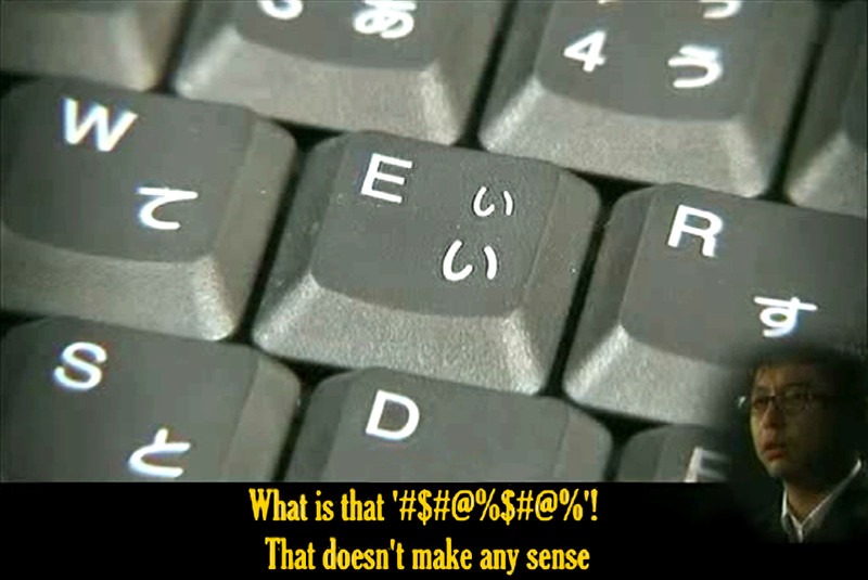 The context of this still from the spoof mystery series 33 Minute Detective ( 33分探偵) is that a murder victim typed out his killer's name in his dying moments, but the detective, in order to comedically stretch out an obvious case to fill up the show's half-hour time slot, posits that the keyboard was set to romaji (the Romanized transliteration of Japanese), so that the actual hiragana word was nonsense.