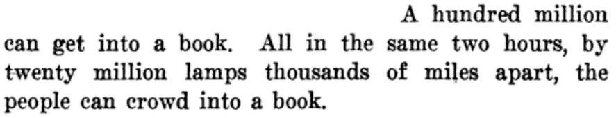 A: One hundred million can crowd into a book, all in the same two hours, by twenty million lamps thousands of miles apart.
