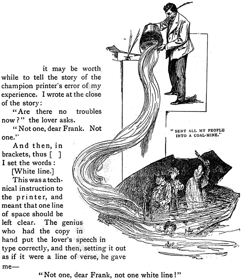 Here's how a line of space literally became a trouble in black and white. Also, there's a picture of an author sending all his characters into a coal mine. From The Idler, 1894.