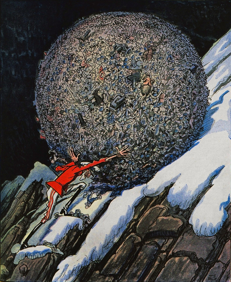 This is a precusor to the video game Katamari Damacy. From Lustige Blätter, 1915.
