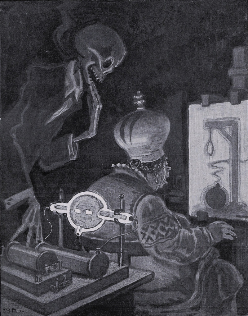 A spirit medium is offered a job to conduct seances. He asks if food and lodging will be included and is told that lodging goes only so far as the table. From Les Hommes du Jour, 1909.