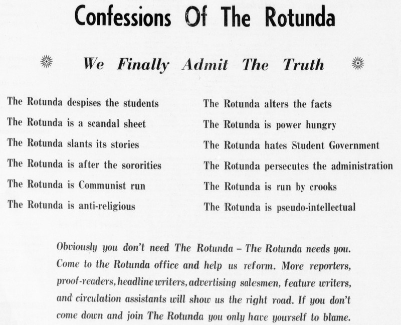 Here's the one and only headline we need in our era of sensationalized journalism. From The Rotunda newspaper of Longwood College, 1964.