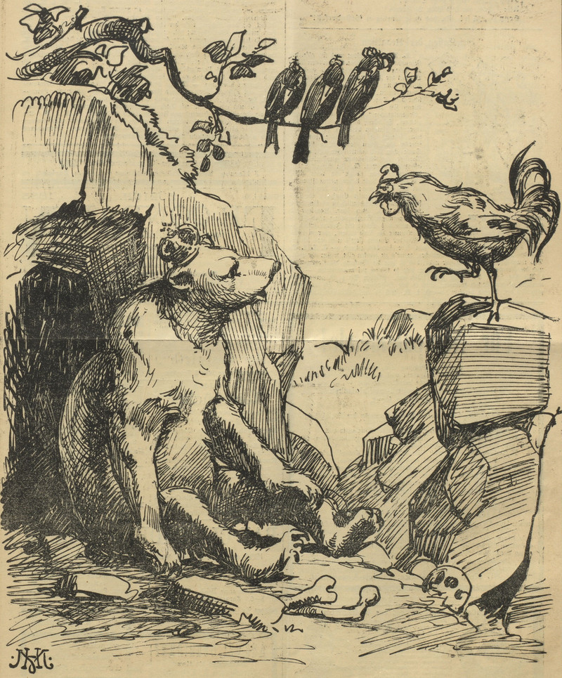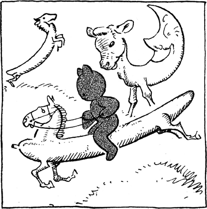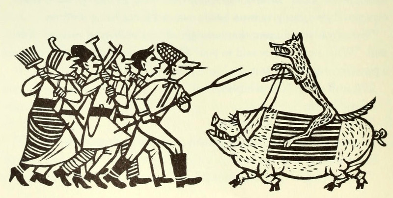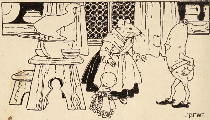 A mouse, a dried pea, and a sausage were roommates. From Nursery Tales from Many Lands by Eleanor Skinner and illustrated by Blanche Fischer Wright, 1917.