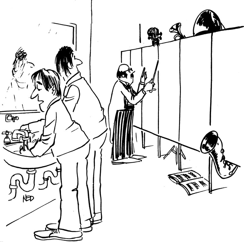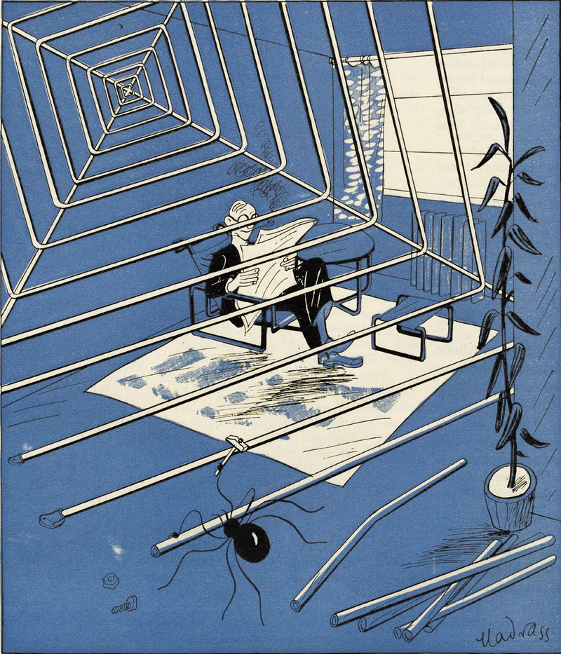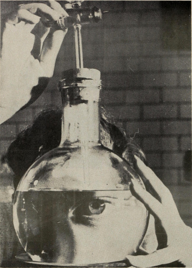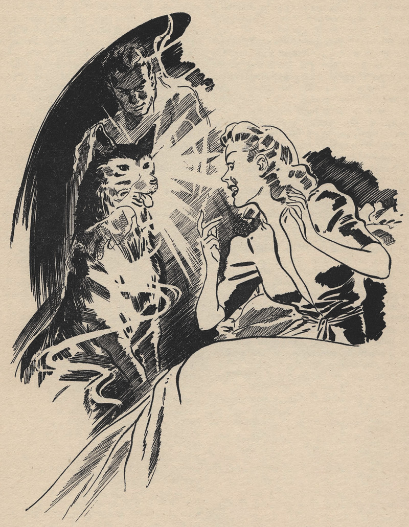 At first glance we thought this was a backsided view of religion, but presumably she's merely reflected in a mirror. Still, their eyes aren't down there, lady. From Together, 1959.