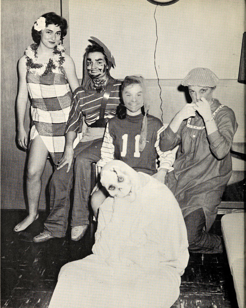 Mop wigs are not restricted to elegant looks. Casual, carefree, even silly moments may be enhanced with mop wigs. From Southern Methodist's 1948 yearbook.