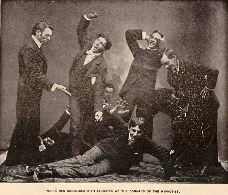 When young men don't find your jokes funny, there's always forced convulsions of laughter via hypnotism, apparently. From Hypnotism As It Is by Xenophon LaMotte Sage, 1900.