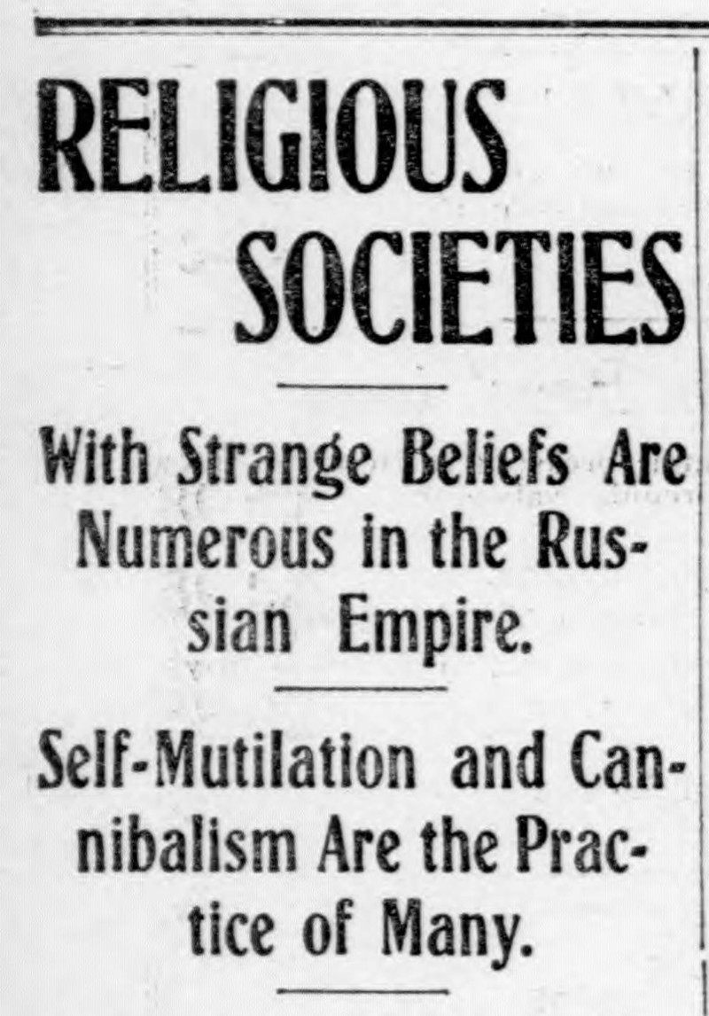 "Religious societies with strange beliefs are numerous in the Russian empire. Self-mutiliation and cannibalism are the practice of many." From the Duluth Evening Herald, 1906.