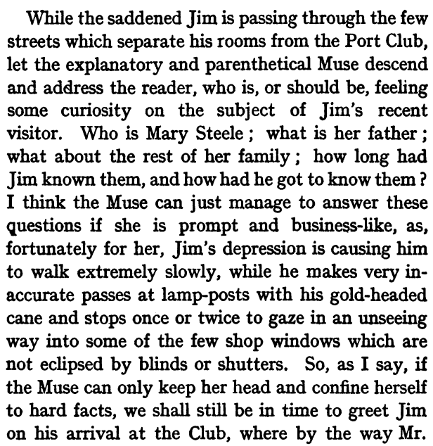 ***[Mr. Cash is a solicitor]The thought of this for some reason caused him to smile, which was so unheard-of a thing to occur in Mr. Cash's room that that gentleman stopped abruptly in the middle of the word "backwardisation" and said, "I beg your pardon, perhaps I am not quite clear?"***[Mis-finished Sentences dept.!]"Besides I should miss all your--""Proposals," suggested Jim hopefully...."Nonsense. 'Racing tips' was what I was going to say."***Ergo, what the dickens and everything else am I to say?[I guess "and everything else" is a sort of blank map of maledicta, eh?]***[Parenthetical!]"Let the explanatory and parenthetical Muse descend and address the reader."[See full passage attached. And then the sequel attachment, in which the narrator really sells the idea that his story is happening in real time.]***This "but------" was the curse of Jim's existence. The riddle of the sphinx and the problem of squaring the circle left him cold.***At about ten o'clock Mr. Cash, in illustrating a mannerism of the female mandrill, knocked over a bottle of brandy.***[On the Port Club's "magic" port wine, which can be deeply indulged with nary a hangover.]Oh unsurpassable and unequalled Port Club Port, two bottles of which will be but a pleasant memory to Messrs. Cash and Grant in the morning! Oh rare grape! Oh skilled bottler! Oh peerless vintage!--how I wish I had ever met you in real life!***He bent still further forward, and his eyeglasses fell off his nose and spun wildly on the end of the curly cord. [Wildly!]***"I was a professor of never mind what at a university in the North of England."***It is well known that once a reader starts skipping he never stops, but takes longer and wilder leaps each time.***One leg of his trousers had formed itself into a kind of spiral knickerbocker and barely descended below his knee. [The rare singular "knickerbocker."]***[Laughing in Turkish Baths dept.]He might, for instance, have a Turkish bath; that wouldn't cost much; but then he hated Turkish baths really. It was so difficult not to laugh in them.***...before you, or anyone else for that matter, could say "Robinson and Cleaver."[I had to look up "Robinson and Cleaver," which turns out to be a once-famous Victorian-era Belfast department store. And of course I appreciate the narrator's thoroughness in specifying that you or anyone else couldn't say it fast enough.]***"I've got to meet Father at half-past three at platform something-or-other."[It's none of my business, but I think this may be taking genericization too far for comfort!]***Jim had at all times the gift of the sort of sleep that no outward physical disturbance could arouse. From his earliest youth cold sponges had, so to speak, left him cold.***[See attached. In which the narrator defends his depiction of the protagonist to a hypothetical, indignant reader.]***[When you can't be bothered to do your own cussing.]"Damn!" said Lush."Ditto," said Jim.***"Damn and blast!" roared Jim...."Blast and damn!" he repeated, and was on the point of adding further words of a similar nature....***A torrent of quite unspeakable though silent oaths was radiating from Jim as from some raging high-powered wireless station. [Oh, if only this book were illustrated!]***the first night of the fifth edition of "Muffins and Crumpets"***[Wait for the epilogue! (attached)]***Bonus: A passing reference in this book to the delightful surname Snelgrove was my first encounter with it. Eager to make up for lost time, I visited Wikipedia to become Snelgrove-aware. There I discovered (Missed Opportunity Dept.) that the Canadian coffee chain Timothy's could have been called Snelgrove's! Goodness gracious, I have done business at Timothy's on, I think, multiple occasions, never knowing there was an implicit Snelgrove lurking!https://en.wikipedia.org/wiki/Timothy%27s_World_Coffee#Origin_and_background