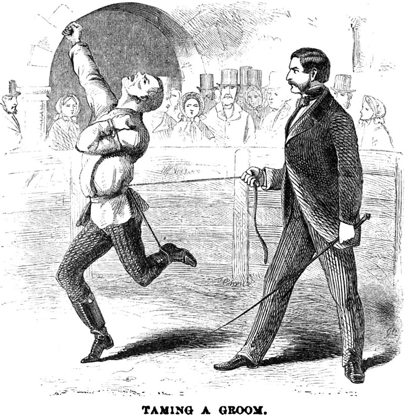 An illustration from an 1860 issue of Harper's magazine. The caption reads: "Taming a groom."