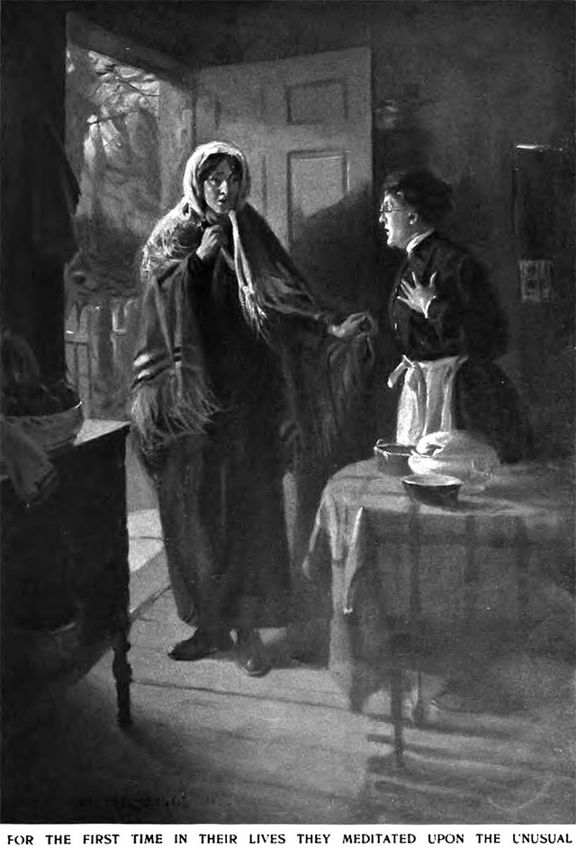 An illustration from a 1914 issue of Harper's magazine. The caption reads: "For the first time in their lives they meditated upon the unusual."
