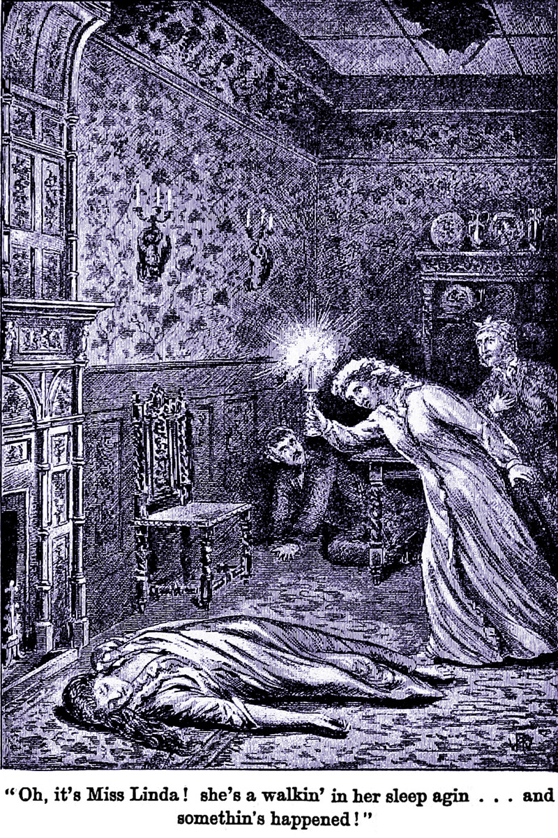 "Oh, it's Miss Linda! she's a walkin' in her sleep agin … and somethin's happened!" From The Curse of the Fevrills by Sylvia Penn, 1888.