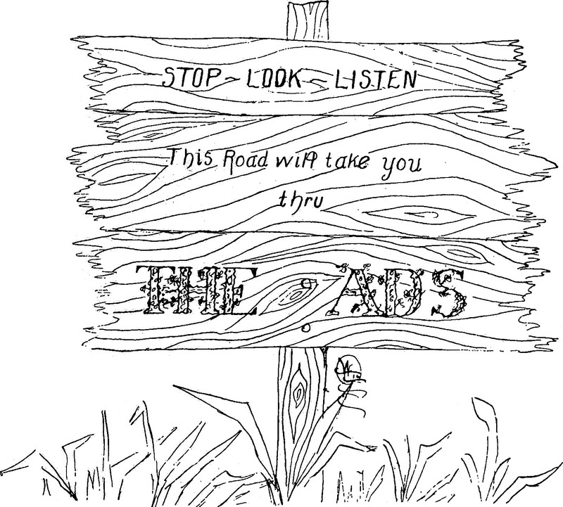 Here's a precursor to billboard pollution, from The Chsite yearbook of Carey High School, 1920. The text reads, "Stop – Look – Listen. This road will take you thru the ads." (For some unbelievably weird yearbook imagery, see our How to Hoodoo Hack a Yearbook.)