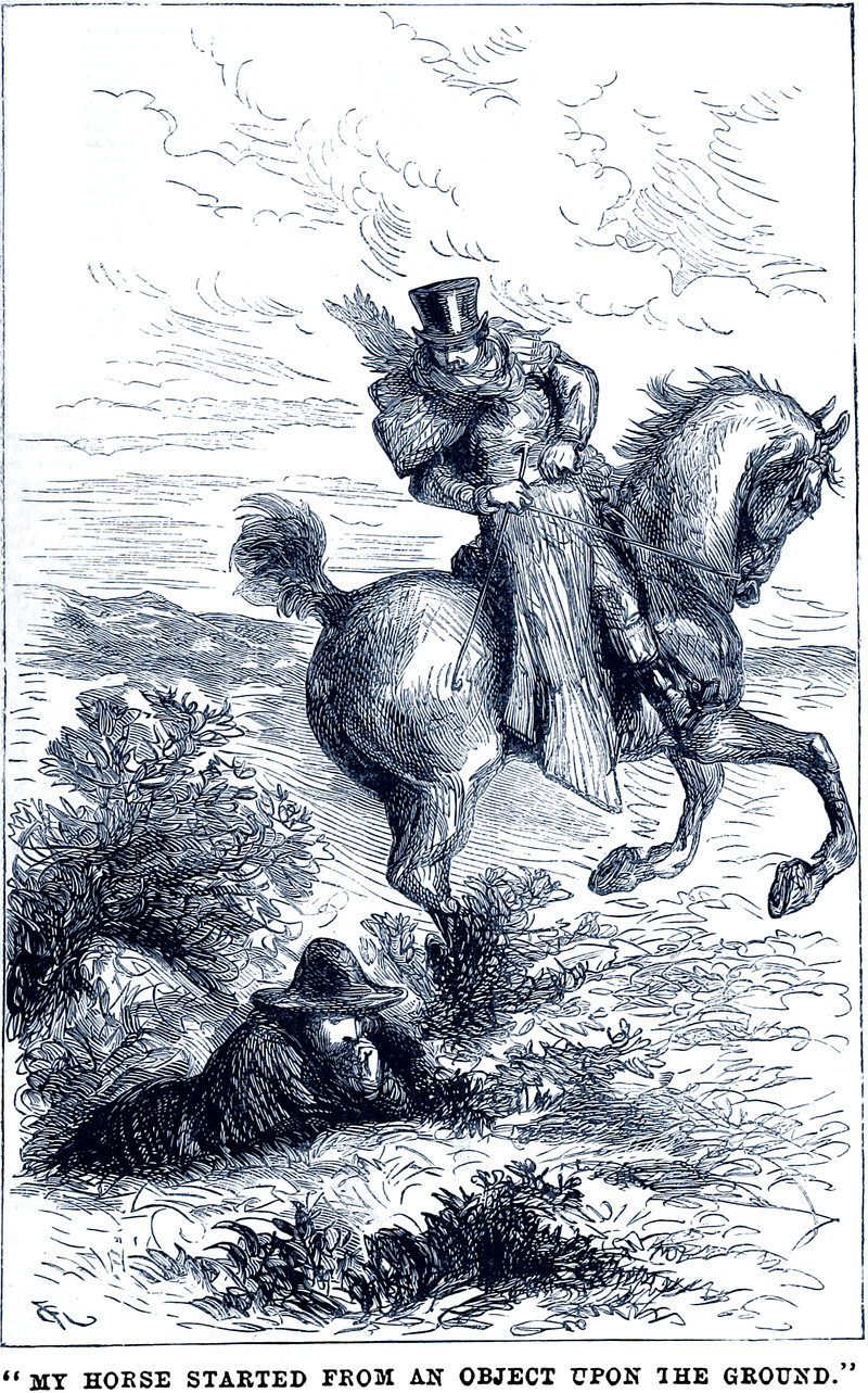 This sort of objectification is going on to this very day. The caption reads, "My horse started from an object upon the ground." From Pelham by Baron Lytton, 1883.