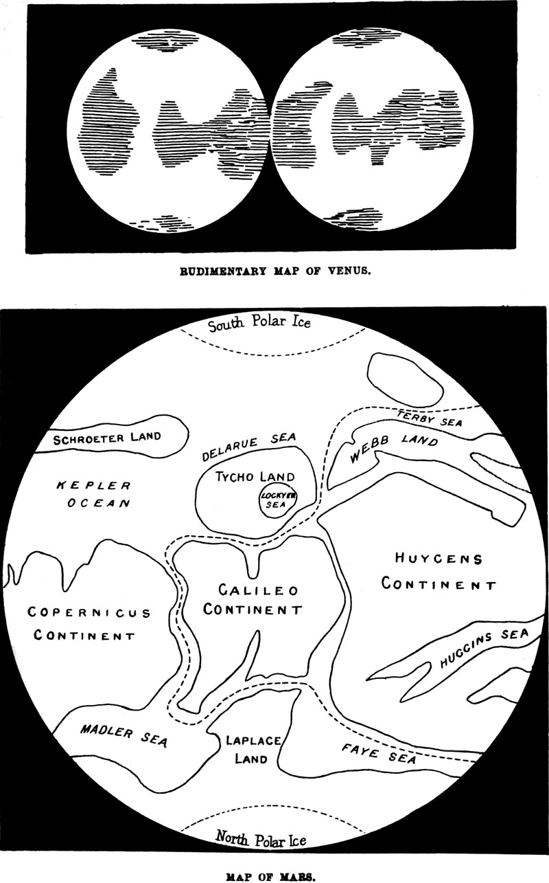 Here are maps of Mars and Venus from Aleriel or A Voyage to Other Worlds by Wladyslaw Somerville Lach-Szyrma, 1883.