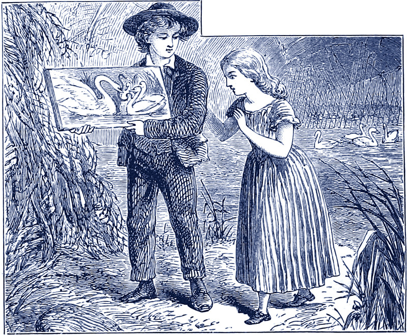 She's captivated by the representation, even as swans are swimming right behind her. We don't even know if that's the point of this image from The Eastern Wonderland by D. C. Angus, 1882. Spoiler: the swans behind her are representations, too!