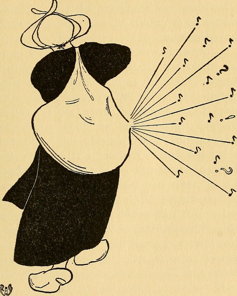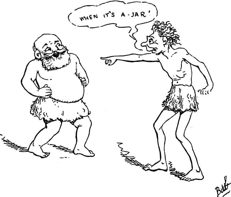 Here's the answer first — a precursor to Jeopardy. From The Bab Ballads, written and illustrated by William Schwenck Gilbert, 1898. The text reads, "When it's a-jar!"