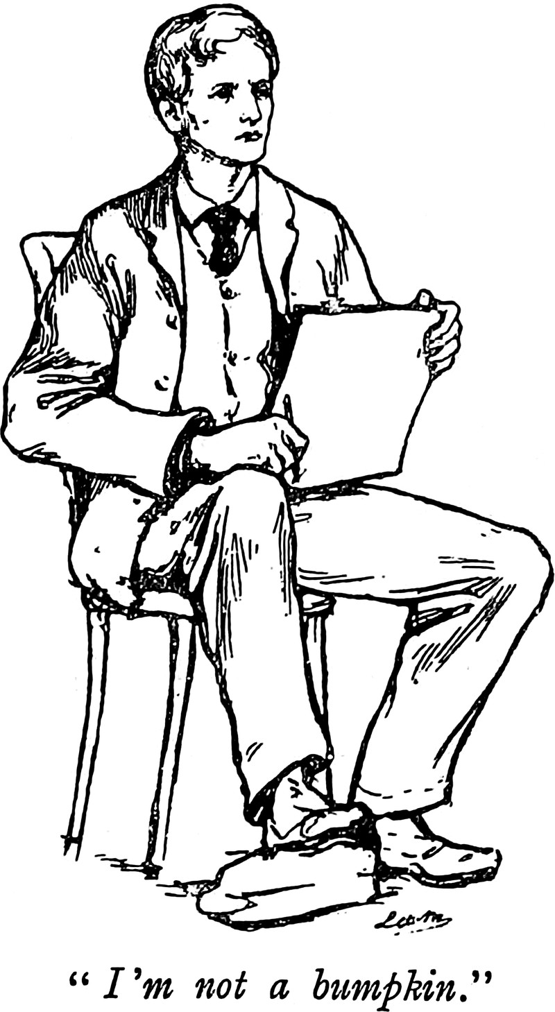 "I'm not a bumpkin," but as the aphorism goes, "If you have to say it, it isn't true." From Belinda and Some Others by Ethel Maude, 1898.