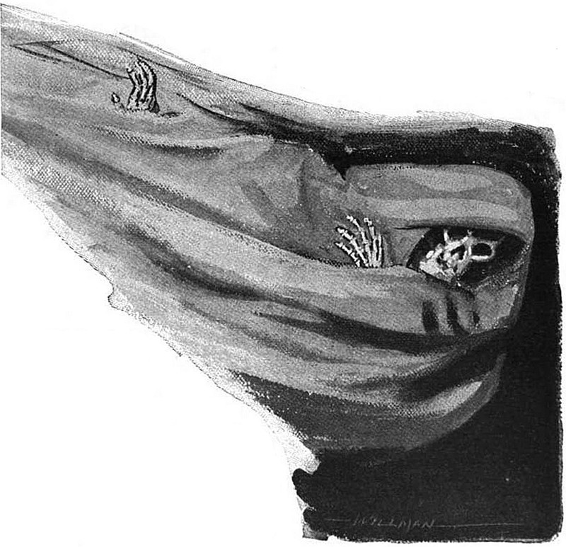 "Through the haze of black smoke came a mocking laugh 'I'll see you again!'" From Weird Tales, 1942.