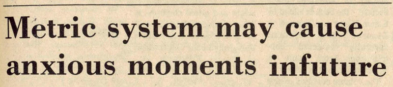 Did you catch the lost wordplay opportunity in this headline? It's that word "anxious" that's wrong. Since the metric system is based upon tens, it may cause "tense" moments. From The Current Sauce, 1974.